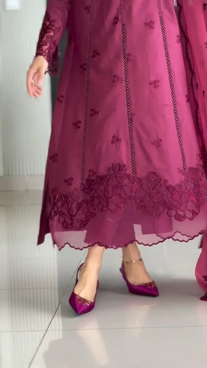 This stitched 3-piece lawn Chickenkari embroidered Alinner frock is a graceful blend of elegance and tradition. The neckline and sleeves are beautifully embroidered on organza, adding a touch of sophistication. The frock features a fully heavy embroidered organza daman, enhancing its overall charm. Paired with an intricately embroidered chiffon dupatta, detailed embroidery work is done on the pallu and all four sides for a refined finish. This ensemble is perfect for formal events or festive occasions, offering both comfort and timeless style. An ideal choice for women who appreciate fine craftsmanship and elegant detailing in every outfit.