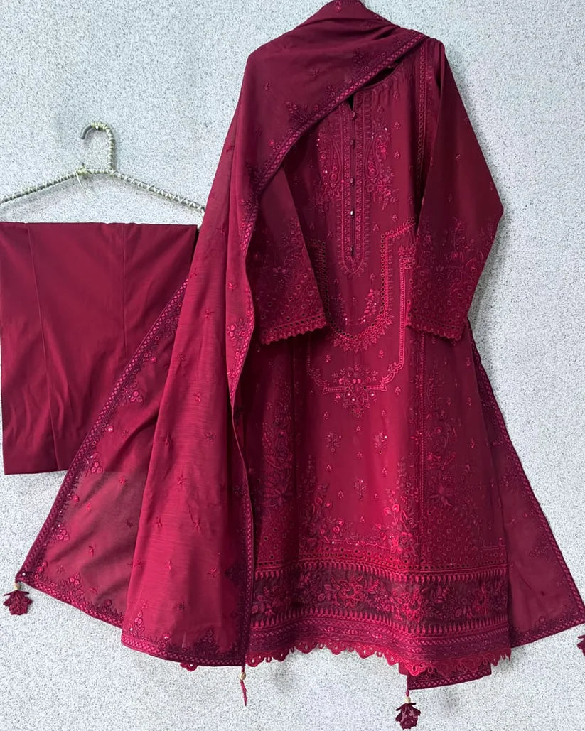 This is a premium stitched 3-piece lawn embroidered dress designed for elegance and comfort. The shirt features a finely embroidered front and sleeves, showcasing intricate craftsmanship. The organza embroidered daman adds a graceful touch, while the chiffon dupatta is beautifully embroidered on all four pallu sides for a complete luxurious feel. Perfect for festive occasions or formal gatherings, this outfit blends traditional charm with modern style. Paired with a comfortable plain trouser, it offers a perfect balance of sophistication, quality, and timeless beauty for your wardrobe.